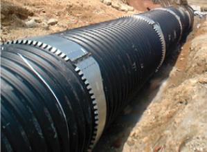 樹脂被覆鋼帯を波付け加工し、これを高密度ポリエチレン層で挟み込み、外面は波付状、内面は平滑に連続成形された金属樹脂複合排水管。