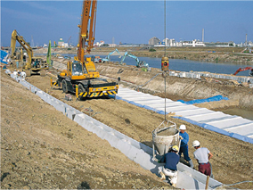 従来、河川、海岸などに用いられている護岸基礎工は、現地での型枠組み立て・コンクリート打設・型枠撤去といった工程により構築されてきた。しかし降雨による河川の増水や地下水の湧水などにより、水替設備の増設や作業員の増員など、工程の長期化につながる要因となってきた。こうした問題点を解決したベースブロックは、製品を布設した後、中詰めコンクリート打設を行うことにより、護岸基礎工の構築が図れる画期的な製品である。