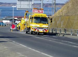 ・従来の自走式ペイントマーカー車に特殊乾燥促進剤(ハードラインアクア#21クイックドライ)を撒布する機械を設置した。
