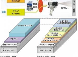 老朽化したコンクリートの表面に被膜を形成してはく落を防止し、強靭化・長寿命化する工法。