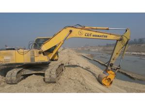 バックホウに装備する締め固め装置を、法面バケットから振動するローラーコンパクターにかえた。