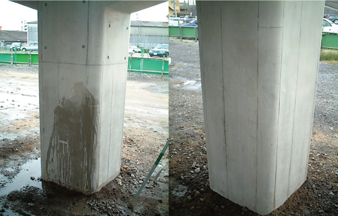 ・塗布後は、標準タイプの場合は無色半透明塗膜に仕上がるため、塗膜下のコンクリート躯体の状況がわかる。なお、調色タイプもあり、常備色はグレー色。