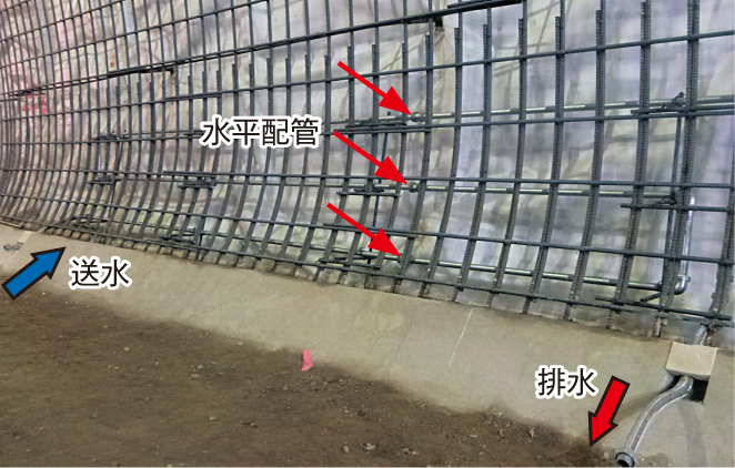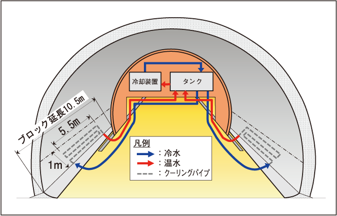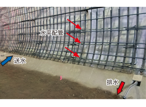 現場打ちコンクリートのひび割れ対策を、膨張コンクリートによる対策から、部分的なクーリングによる対策とした。