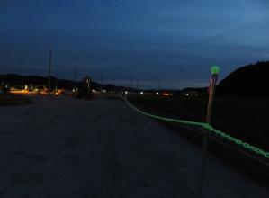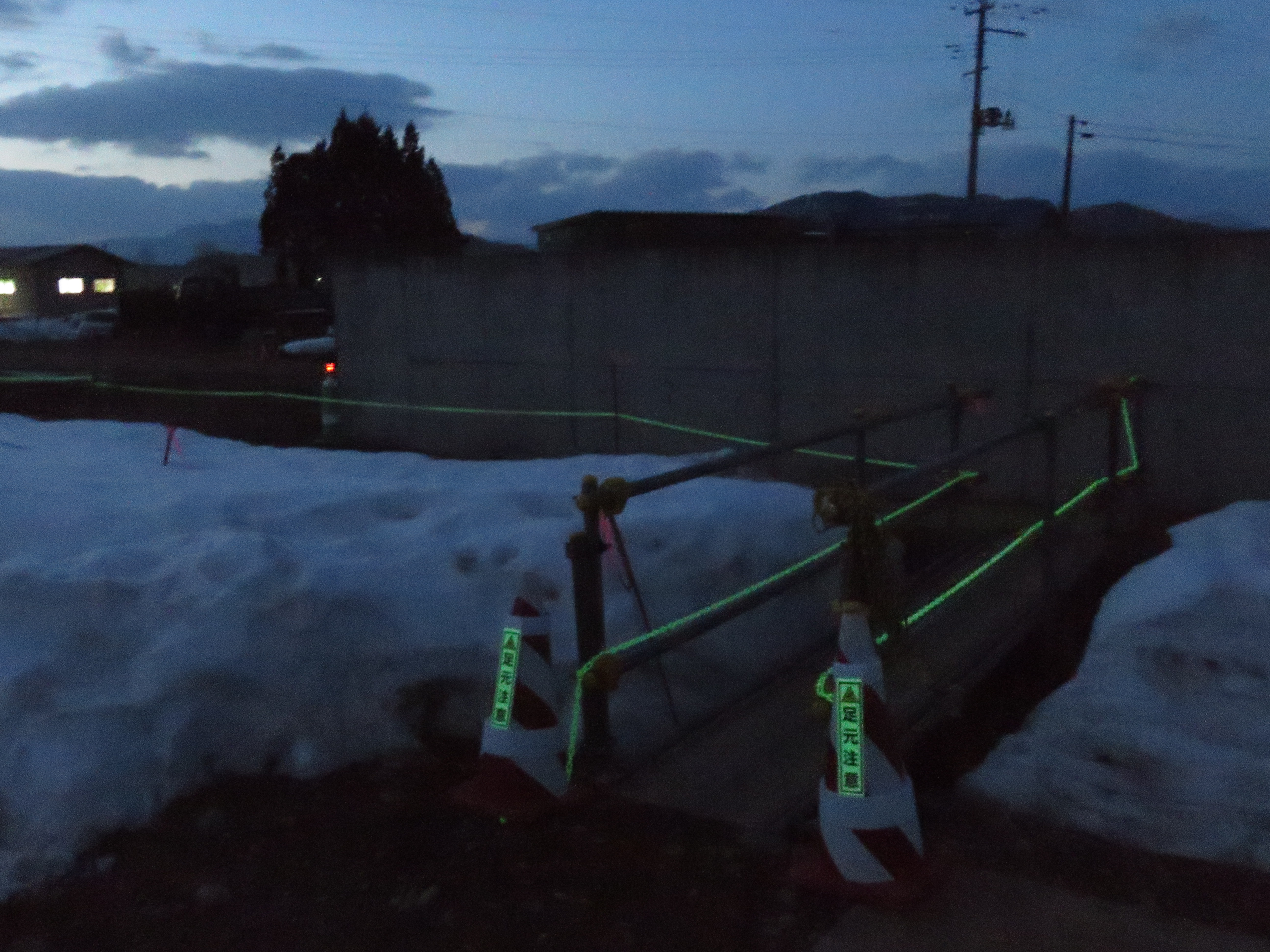 高輝度蓄光プラスチックチェーンの蓄光による夕暮れ時の発光にて、工事区域表示の視認性が高まり安全性の向上が期待できる。