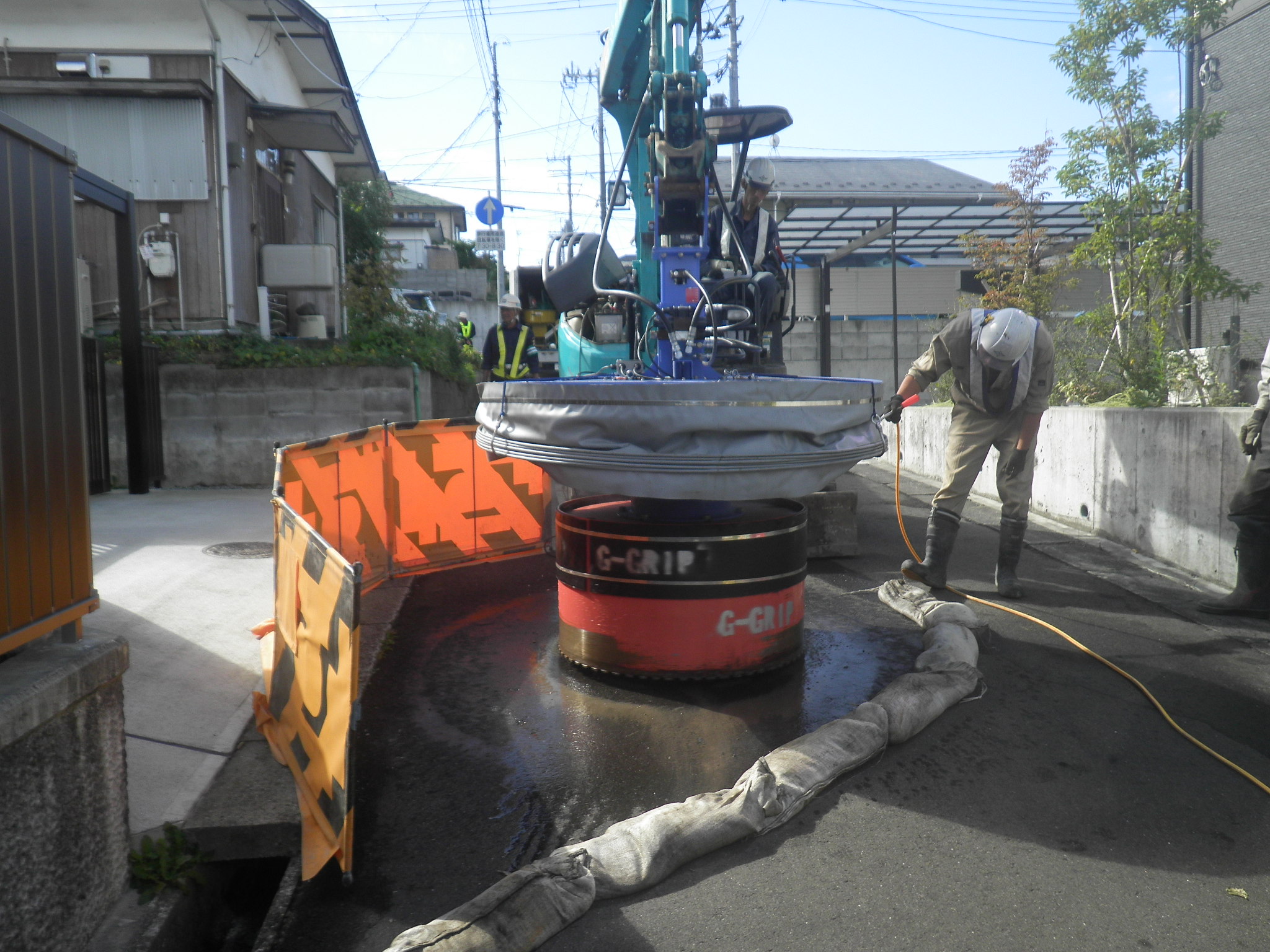 ・バックホウに切断深さ40cmまで切れる円形カッター装置を取付けた。
