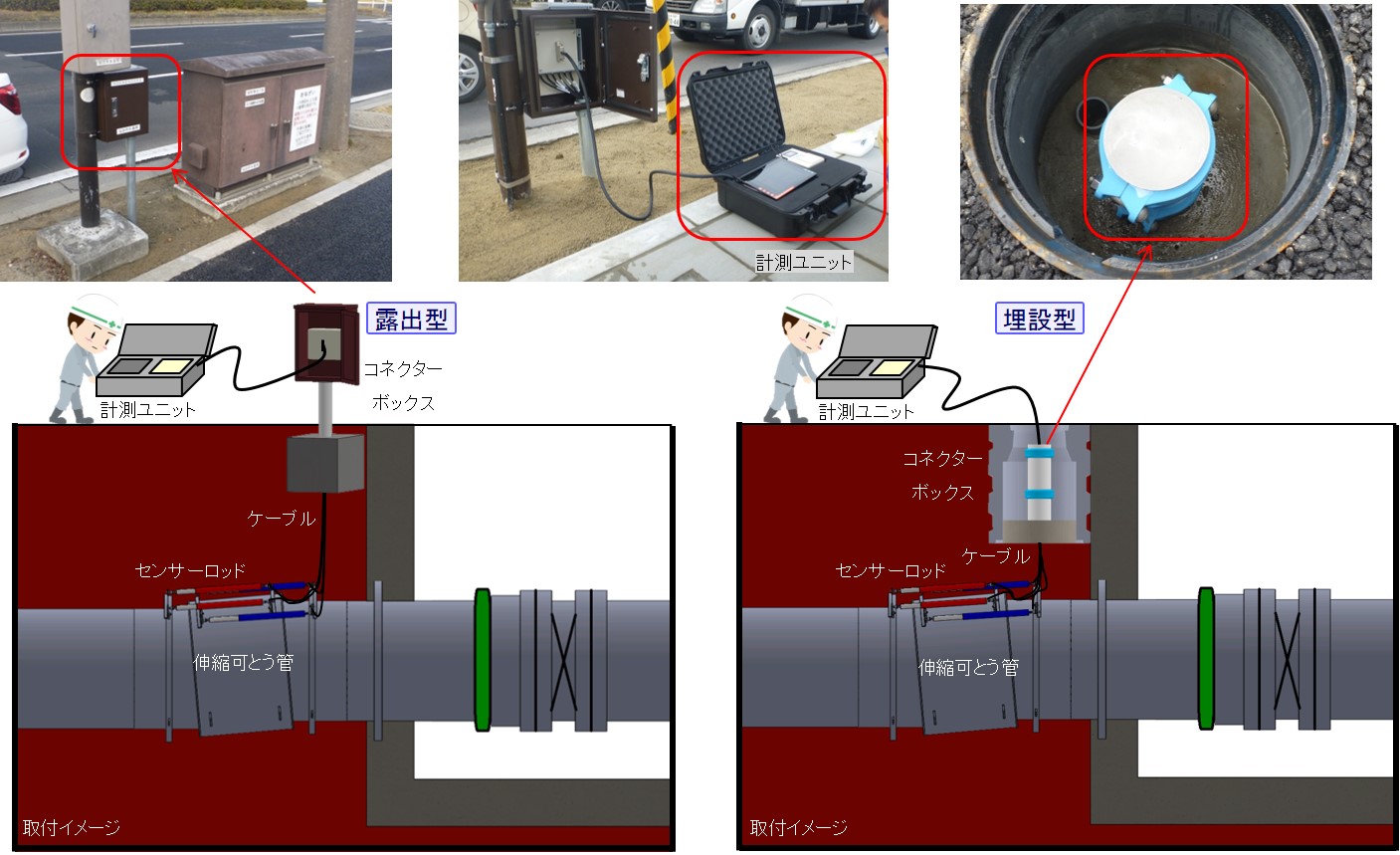 ・伸縮可とう管の埋設時からの経年的なズレを計測できるため、管路に支障を及ぼさない時期に適切な保全・交換が行え、維持管理の内容が向上する。