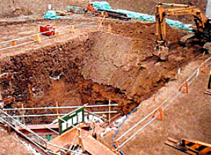 従来技術の仮設土留工は特殊作業員、運転手(特殊)、とび工、溶接工による鋼矢板、切梁土留工等であったが、本技術は構造物の掘削に先立ち汎用バックホーを使用し、地山とセメントの攪拌・混合を行い、地下にセメント改良固化土留壁を築造し、その後、土留壁の不要部分を削り取りながら、構造物掘削を行うものである。
