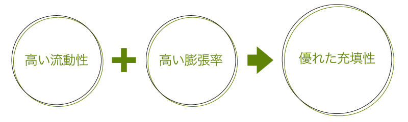 ・高い流動性と体積膨張により狭隘な空隙でも高い充填性が得られる。