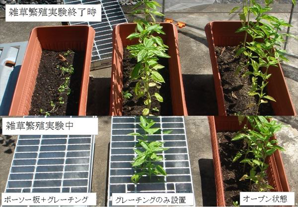 ・従来、側溝内で繁殖する雑草の防草対策は行われていなかった。特に、グレーチング部で雑草が繁殖すると、排水断面の阻害と、ゴミ詰まりの原因となり、排水処理の妨げになる。そこで、遮光板を設置し、雑草の成長阻害による防草対策を行った。
