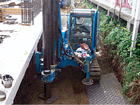 ・鋼管杭の地盤への埋設は鋼管杭自身を油圧モーターによる回転貫入で行うため低騒音・低振動かつ無排土で施工できる。