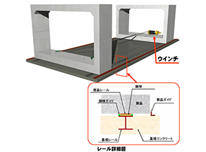 ・コンクリート二次製品を移動する際は、予め基礎コンクリートに基礎レール(H鋼:100×100-フランジが上面の方向)を埋込む。鋼球ガイド(丸鋼:φ13)は、基礎レールの両脇に溶接で固定する。製品ガイド(等辺山形鋼:75×75)をアンカーボルトで基礎コンクリートに固定し、鋼球(φ11)を配置する。製品レール(平鋼:44×1700×t9)は、予め製品の底面にアンカーボルトで固定する。その後、コンクリート二次製品を基礎レール上に仮置きし、ウインチ等で移動を行う。