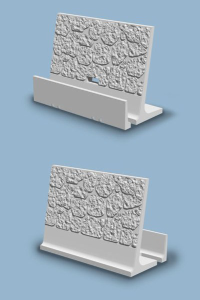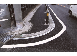 ・露出面が自然石模様のコンクリートブロックであるため、美しい景観を創出でき、模様面が傾斜していることにより、車の運転手や歩行者に対しての威圧感を和らげることができる。