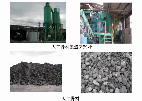 ・他産業から排出され、運搬によるCO2の排出量が多く、経済的負担が大きいために用途開拓が望まれている石炭灰と、建築現場から排出され、同じく用途開拓が急がれている石膏ボード由来の廃石膏を有効利用して人工骨材を造り、従来のコンクリート塊・アスファルトコンクリート塊と混合・破砕・分級した。