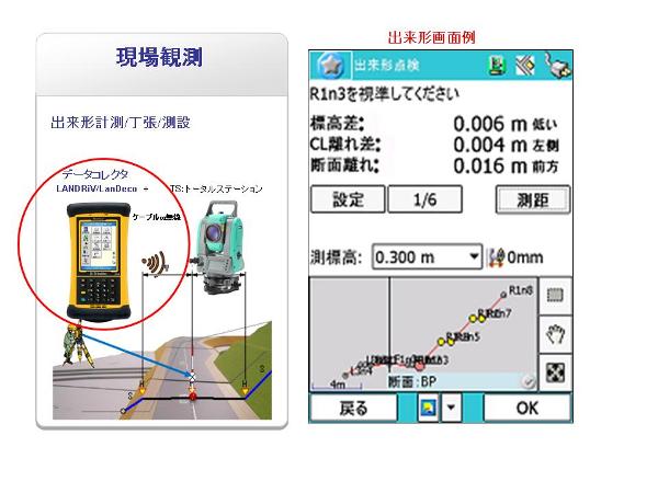 従来は、内業で路線計算ソフトを使用し設計データの復元、変更、段取り計算を現場の段階に応じて行っていたが、本システムでは3次元設計データを現場で常備し、既定断面+任意断面における設計点及び計画線との比較(断面離れ、計画面水平距離、計画面垂直離れ、計画面鉛直離れ、観測点法長、始点鉛直高、始点水平距離、観測点標高)をリアルタイムにかつ正確に管理することができる。そのことにより、着工から完成までの現場作業の効率及び品質向上がアップする。また、計算書の読み取りミスやレベル、テープ計測時の読み取りミス、記載ミスが起こりうる従来方法とは異なり、TS(トータルステーション)と接続されたデータコレクタに設計値、観測値、較差が表示され、確認ができることにより防止できる。