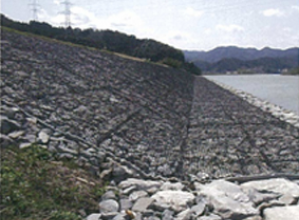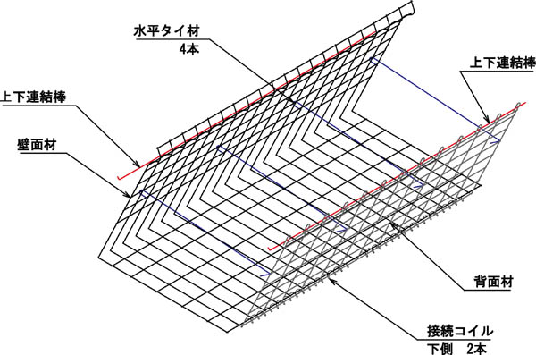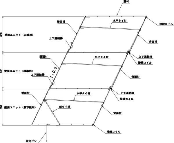 ・ユニット形状は平行六面体で、高さ600mm、幅1000(1200)mm、長さ2000mmであり、網目は100mm、線径φ6mmである。