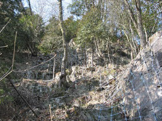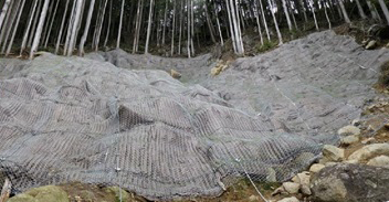 ・格子状にしたワイヤロープとアンカーによる抑止力・支持力により落石を予防する工法であり、吹付プラントの設置の必要はなく、大型機械が搬入困難な山腹や民家裏などの狭隘な現場における施工が可能となる。
