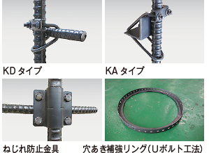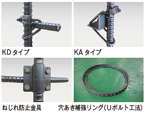 ・従来の無溶接Uボルト工法では、補強筋を「孔開け加工済の補強筋(平鋼)」に限定していたものを、当該金具では補強筋の種類が「平鋼」「異形棒鋼」「山形鋼」などでも固定できるよう、種類に合わせた金具を用意する事が可能となり、設計の段階で補強筋の種類を自由に選択する事ができるようになる。