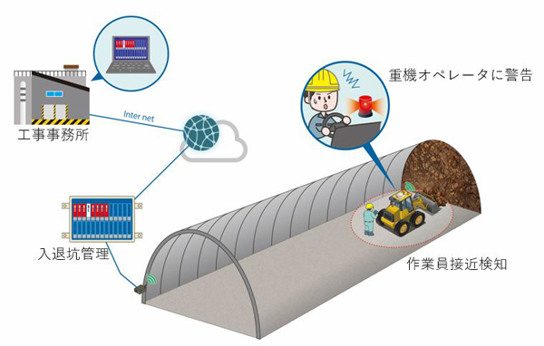 ・トンネル坑口に設置された検知機より磁界を発し、作業員が所持したICタグより電波にてIDを返し、入退抗管理を行う。