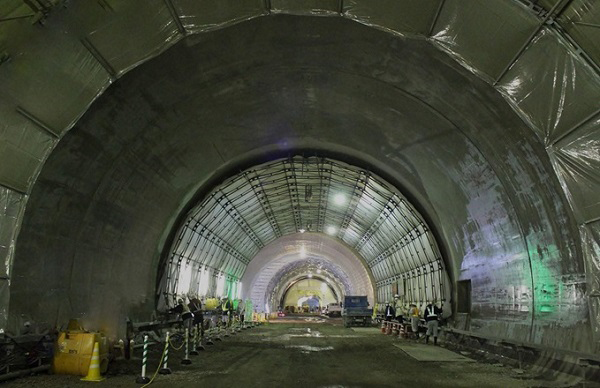 ・覆工コンクリートを打設するトンネル現場。