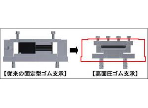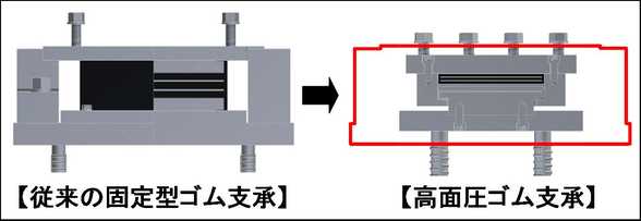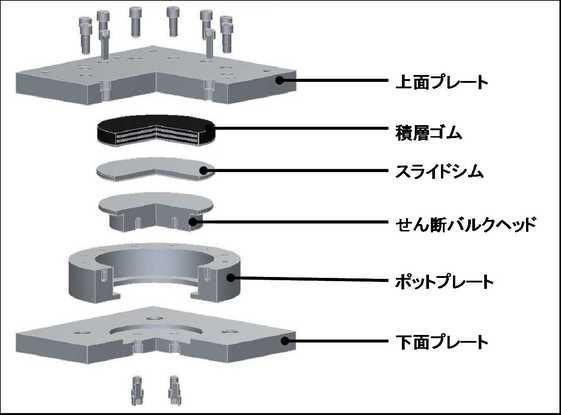 ・従来は積層ゴム単体で支持する構造だったが、積層ゴムを空隙のあるポットプレートで拘束する構造(可変拘束構造)とした。