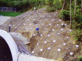 ・ロックボルト設置後は、プレストネット工の部材が軽量のため人力作業で施工可能でありクレーン等の機械類は必要としない