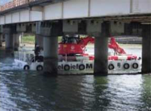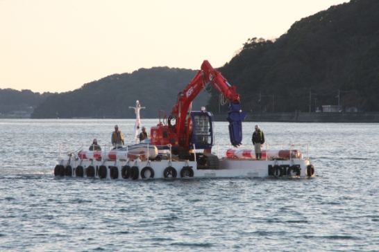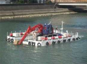 ・組立式小型自航艇で、輸送可能重量が41t(喫水の設定により変動)で、クレーンやバックホウ、重機アタッチメントなどが積載可能とした。