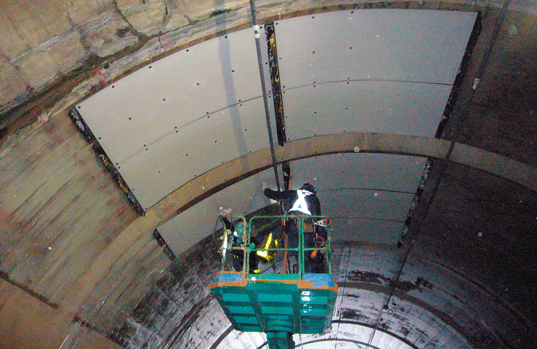 ・鋼板接着工法、連続炭素繊維シート直貼工法から、軽量な成型版パネルに変えた。