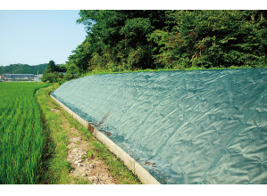 ・従来の草刈機等を用いた除草工から、遮光性、通気性、透水性のある防草シートの敷設により、3年間の雑草生育の抑制を行う。