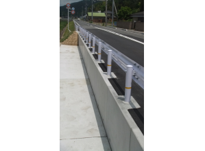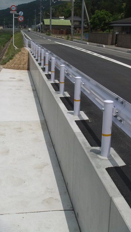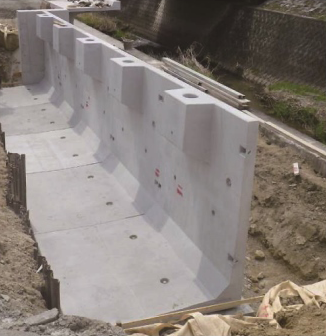 ・L型擁壁に車両用防護柵基礎を一体化させたプレキャストL型擁壁。