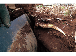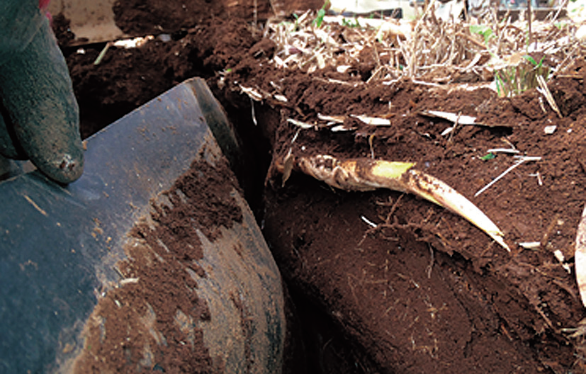 従来技術の建築空洞ブロック積による根茎処理を行うが、材料費、人件費、施工日数がかかり経済性に欠ける。また地震等の災害が発生した場合、柔軟性が欠けるためクラックや破損のリスクが高く、目視確認することが困難である。