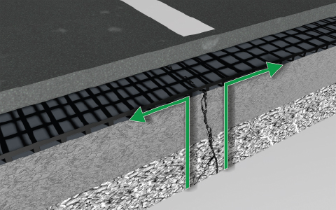 ・引張強度UPと低い伸長率により、アスファルト舗装面のリフレクションクラックを抑制し、品質の向上が図れる。