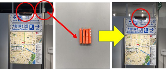 Beacon(無線通信にて情報サービスを提供する機器)とソーラー発電式小型LED照明灯を一体化したことにより、次の効果が期待できる。