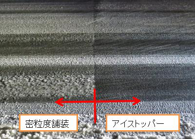 ・工業用ゴム端材利用品のゴム粒子を混入した粗面型砕石マスチック混合物に変更するとともに舗装表面にゴム粒子を散布接着させた舗装としたことにより、舗装表面および混合物中のゴム粒子が交通荷重によりたわむことで、氷雪を破砕・除去し路面露出を促進する凍結抑制性能が発揮される。