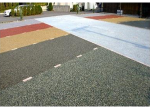 ・従来の密粒度舗装に使用する密粒度アスファルト混合物を工業用ゴム端材利用品のゴム粒子を混入した粗面型砕石マスチック混合物に変更するとともに舗装表面にゴム粒子を散布接着させた舗装。