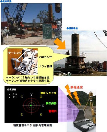 ・杭鉛直精度の管理における測量・連絡・施工・管理作業を独自のシステムを活用し機械化することで、オペレータ単独でできる簡易な作業に改善されるので、施工技能者の高齢化や人手不足により新しい技術の受入や習熟した施工技術の伝承が困難な環境において本システムは新規導入の障壁が少ないシステムである。