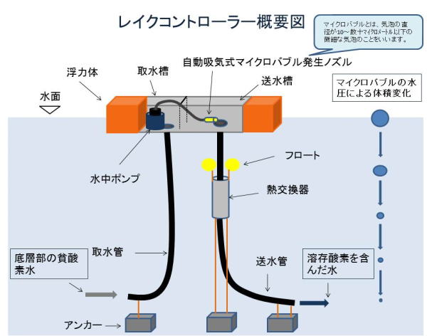 ・水中ポンプで貧酸素水層の水を揚水する際、ポンプの吐出口に取り付けたノズルから自動的に空気を取り込みマイクロバブルを発生させる方式で、曝気(貧酸素水層の水に溶存酸素を含ませる)が行える。