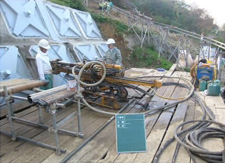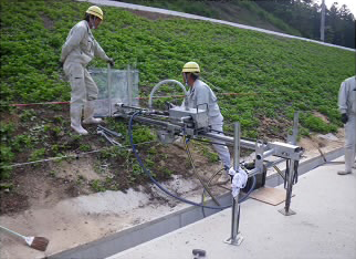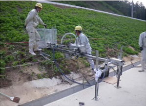 ・従来は大型のロータリーパーカッション式ボーリングマシン(2.5t)を用いていたが、本技術は小型軽量の専用機「排水パイプ打込み機」(0.1t)で先行削孔及び打込みが可能となった。