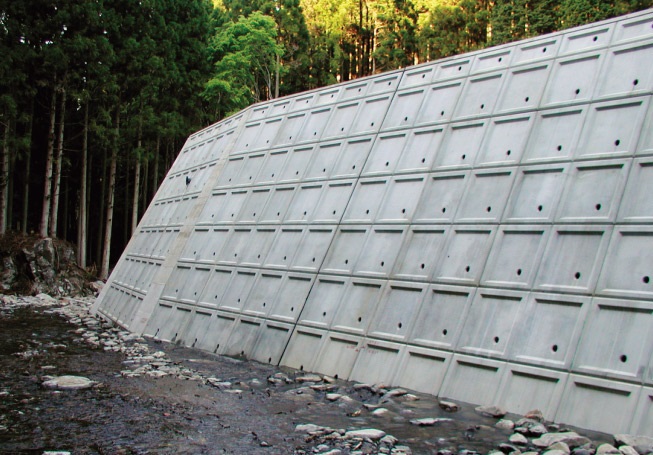 ・製品は大型化(2.236平方メートル/個)、練積専用タイプとし製品重量を軽減、前壁に勾配(1:0:5)を付けた。また、インサートを埋込んだ製品と専用裏型枠(KCパネル)をセパレータ(KCセパレータ)で連結することにより、型枠の組立て脱型作業が軽減(裏型枠は残存が可能)、型枠工を必要とせず、工期の短縮が期待できる。