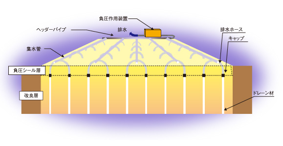 ・載荷圧力として真空ポンプによる負圧を用い、圧密地盤改良に載荷盛土が不要もしくは減量できるようにした。