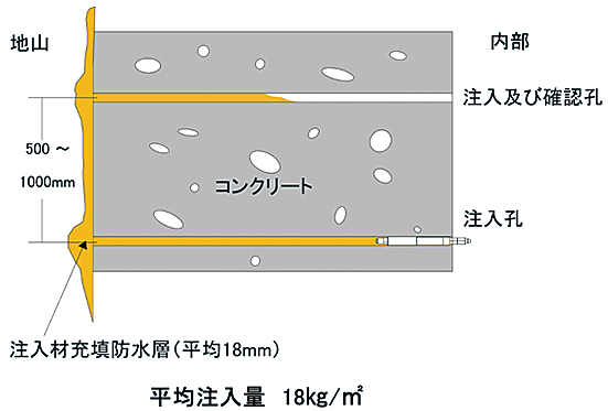 ・ビトグラウト-UGを注入することで、土圧・水圧にて漏水原因である躯体コンクリートの劣化損傷部に注入剤を逆流・浸透させ止水すると共に、裏面に遮水層を形成する。