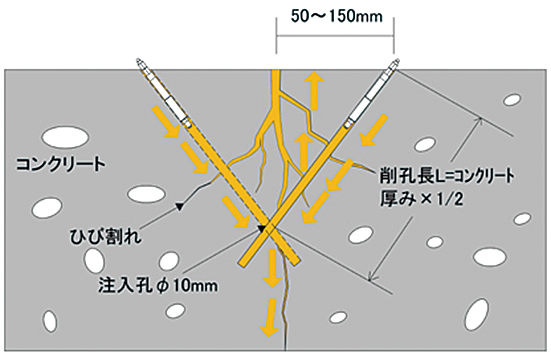 ・微細なクラックを対象とした先行注入剤ウォーターセラミックGFと、主クラックを対象とした水性エマルション樹脂の2種類の材料を用いることにより充填のばらつきを無くした。