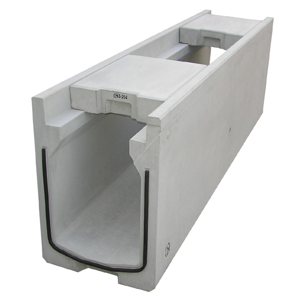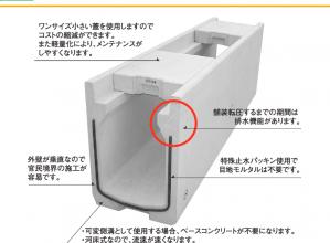 排水舗装を施した道路の表面排水を促すため、製品側面の天端側に排水溝(ミゾ)を、製品端面に排水ドレンを設けた。インバートコンクリートの打設可能な構造(底版部にインバートコンクリート剥離防止用の切りカケを設置)で、自由勾配側溝としても使用可能。