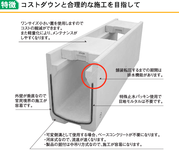 側溝側壁の外壁が直壁であり、従来のU型側溝(PU落蓋式)と比べて官民境界の施工が容易となる。また、据付後の埋戻しにて均一な転圧・路盤施工が可能となり、不等沈下が起きないので舗装の耐用年数の向上が可能。また、使用する蓋のサイズが小さいため施工性が向上する。