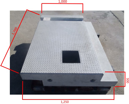 ・仮設防護柵の基礎部に、工場製作の付帯設備(横断防止柵、溝蓋、側溝、縁石)設置用の溝が形成されているPC版及び擁壁型のPC基礎を使用する。