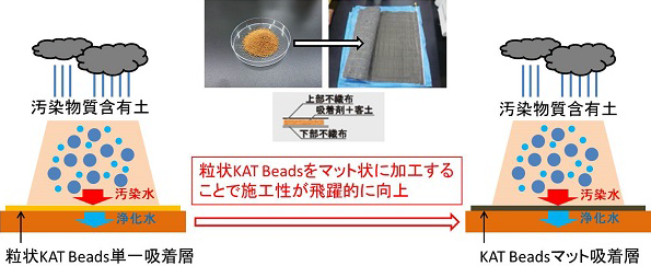・遮水シートを用いると重金属を含む浸出水を集水し水処理を行う必要があるが、KAT Beadsマットは発生した溶解性重金属類のみを吸着し安全な浸出水を透水させることが可能であり水処理設備が不要となる。