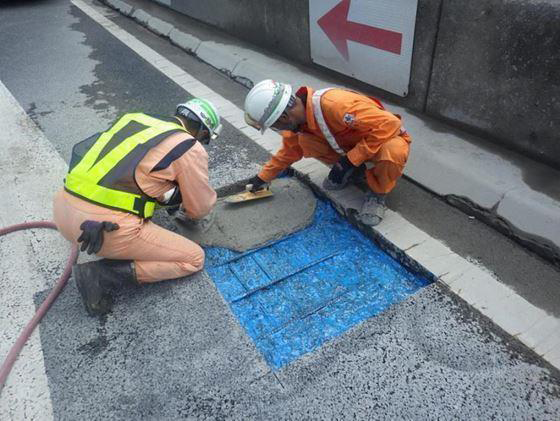 コンクリート上面補修材を超速硬コンクリート用パック詰めから、繊維補強超速硬ポリマーセメントモルタルまたは繊維補強超速硬コンクリートに変えた。