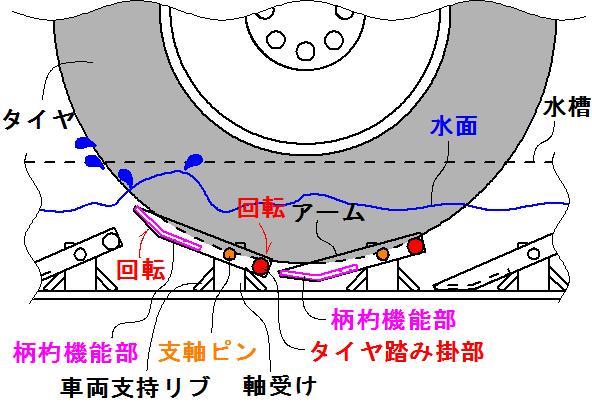 ・本装置は、唯単に水槽内を通過するだけでは落とし切れなかったタイヤに付着した泥土を、運搬車両自身のタイヤが洗浄機能プレートの一端を踏むことで、強制的に水を撥ねかけて洗浄するという簡素な構造のタイヤ洗浄装置であって、上記の欠点を改善することが達成出来た製品である。