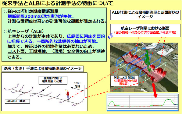 ・従来技術と比べ、高い空間分解能を有する陸域と同様の空間分解能を有する水域の3次元データは、河床や海底の洗掘・深ぼれや堆砂状況を面的に把握できる。