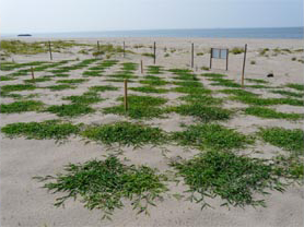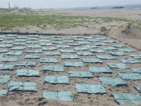 ・掘削した箇所にマット状の植生基盤(1m四方)を市松張りにして埋戻しするのみであること、かつ、面倒な静砂垣の編込作業等が不要なことから、施工性が単純であり、静砂 垣+砂草植生工法に比べ施工性が向上する。