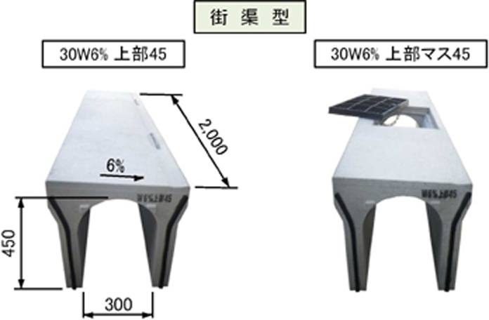 ・天端勾配が6%で片勾配の街渠型と、天端勾配が6%で両勾配のV形にした。また、V形には1%勾配の製品も揃えた。